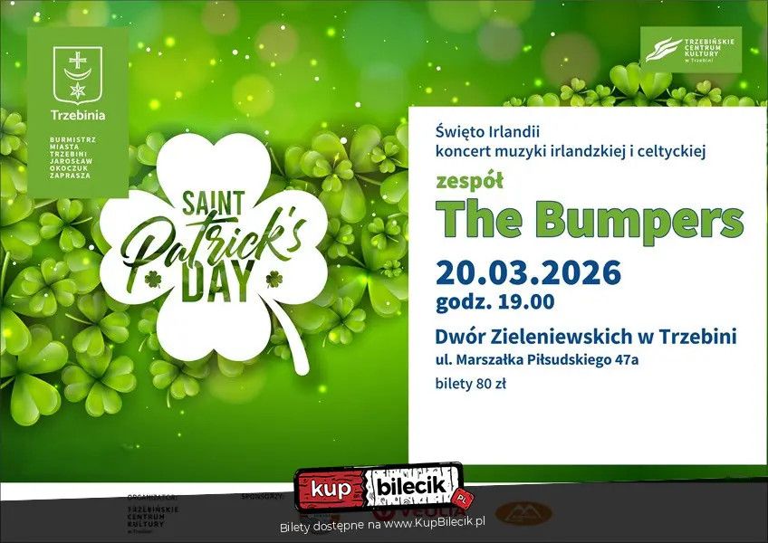 bilety: Koncert z okazji Dnia Św. Patryka czyli Narodowego Święta Irlandii, w którym wystąpi zespół The Bumpers. The Bumpers artyści: Albert Żukowski - gitara, śpiew Maciej Cylwik - śpiew Piotr Jancewicz - banjo, śpiew Andrzej Chomanipoczątki inicjatywy datują się na późne lata osiemdziesiąte. Wtedy to kilku znajomych z żeglarskiej drużyny harcerskiej Błękitna Dziewiątka, pod wodzą Alberta Żukowskiego, założyło zespół Odbijacze, specjalizujący się w wykonywaniu szant i pieśni morskich a capella. Zespół wystąpił na kilku festiwalach żeglarskich, między innymi na jednej z pierwszych Kopyści w Białymstoku. W 1989 roku wykrystalizował się skład, w którym Odbijacze z powodzeniem koncertowali. Z czasem w zespole pojawiły się pierwsze instrumenty. W 1991 roku zespół zmienił nazwę na bardziej międzynarodowo brzmiące The Bumpers, do zespołu dołączyli obecnie grający, a śpiew a capella został powoli wyparty przez muzykę o silnych korzeniach irlandzkich. W tymże właśnie roku po raz pierwszy wystąpili w studenckim klubie Co Nie Co. Inspiracje muzyką żeglarską jedna pozostały i pobrzmiewają w ich utworach do dziś i nierzadko można je usłyszeć przy mazurskich ogniskach. Bilety do nabycia na: KupBilecik.pl |